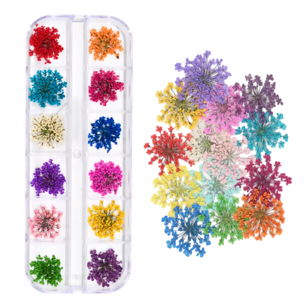 De bloemen variëren in formaat, met een gemiddelde grootte tussen de 17 en 27 mm. In de selectie vind je onder andere gypsophila, hydrangea, chrysanthemum, daucus carota, chrysanten en oxalis acetosella.