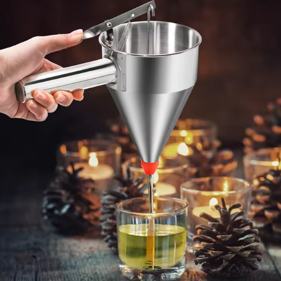 Gietwas trechter dispenser: ideaal voor het nauwkeurig vullen van kaarsenmallen en potjes.