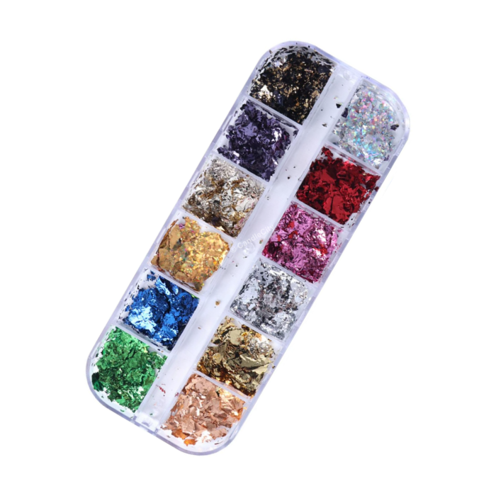 Metallic folievlokken in 12 verschillende kleuren per setje.